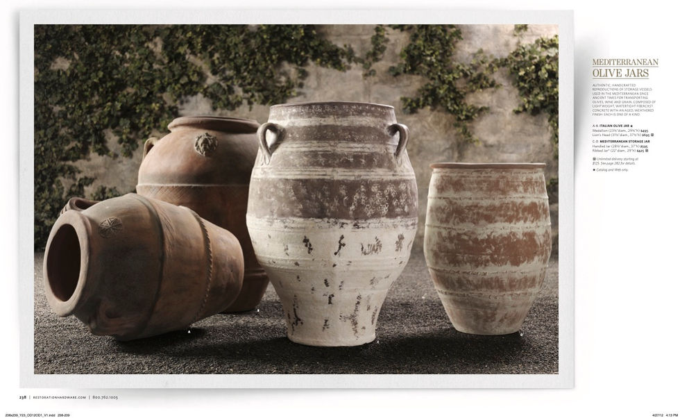 A collection of images showcasing various outdoor decor items such as lanterns, planters, and Mediterranean olive jars. The images capture the ambiance of warm candlelight, elegant lanterns by a poolside, and large black planters on a sunny patio.